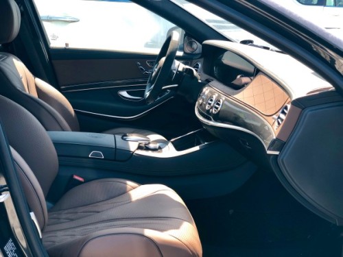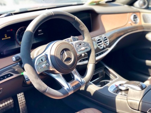 内饰方面:19款奔驰S63 AMG沿用了奔驰全新设计风格,其内饰面板和车顶均由真皮包裹,突显其豪华感。中控台设计较为简洁,配备有两块大尺寸液晶中控显示屏,全新三幅式多功能方向盘采用白色真皮包裹,并用银色镀铬进行点缀,科技感十足。