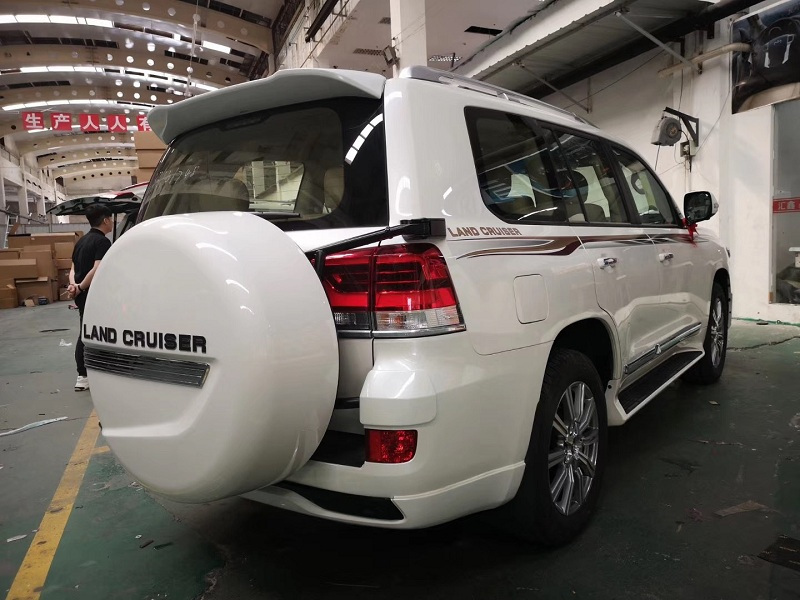 尾部可以看出来这款车加装一个尾翼。行李架。后挂备胎罩,这款车改装一个底挂,看一下轮毂这个轮毂比较火,现在丰田酷路泽好多都是改装这种轮毂是20寸雷克萨斯轮毂,相当霸气的存在。