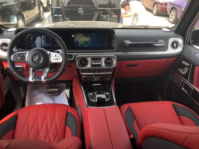 2019款奔驰G63 (配置|询价)内饰保留了新G500 (配置|询价)的整体设计,除配色差异外,新车还换装了全新造型的平底式AMG运动方向盘,其两侧配以打孔皮质包裹,下部镀铬装饰的造型也与新G500明显不同,看上去十分战斗。此外,全液晶仪表盘+中控大屏的双12.3英寸屏幕设计在新车上也没有缺席,营造出了浓郁的科技感。