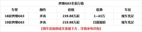 现车价格行情,全新19款奔驰G500 (配置|询价),G63 (配置|询价),G63先行特别版,颜色现车价格有惊喜,接受预约特殊颜色,G500、G63可分期售全国。第一时间为您从奔驰官方调整配额到您手中,Mercedes-Benz梅赛德斯。奔驰全新G级,纯进口奔驰G500、G63持了纯朴无华的复旧气势,在经典中穿插当代。但筹划更加凸起的前保险杠、全新的侧后视镜和轮毂造型,让其显得越策动感和拥有攻击性。增加时行的LED白天行车灯计划,而尾部根基无扭转,留存了其一贯结实的打算风格。