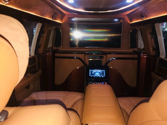 由于2019款林肯领袖一号的内饰是要经过重新设计,纯手工打造,那么我只能借助上一代领袖一号的内饰来给大家做对比。通常像领袖一号这种加长商务越野,内饰布局上前后舱隔开设计,隔断上配置升降电视。座椅则是对坐设计,再通过各种巧妙的设计,让各种电子设备融入车内。