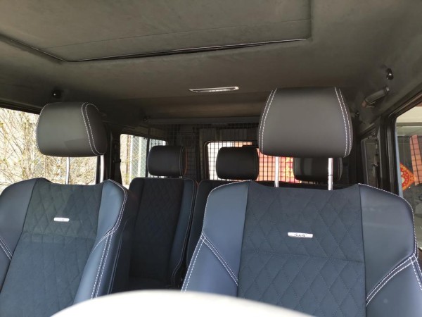 18款奔驰G 4x4离地距离 450mm、涉水能力 1米、轮胎间距 1.744mm、3种驱动模式、22寸轮毂、每个轮胎带有两个减震器及两个悬架弹簧 22轮;红卡钳;双减震;单天窗;氙气大灯;LED日行灯、18向多轮廓电动包裹座椅;翻毛皮内饰(皮+翻毛皮双拼座椅;翻毛皮方向盘;翻毛皮门板;翻毛皮内顶);前座椅加热通风;二排座椅加热;哈曼卡顿音响(14个扬声器);三把差速锁;碳纤维内饰套件;脚踏;前雷达;倒影;导航;多功能方向盘;定速巡航;换挡拨片。