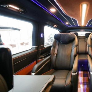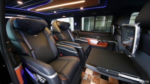 奔驰威霆:黑车,米和深棕双拼内饰,7座,中文导航,中央竖屏式大屏导航,LED兽眼大灯,顶配流线型中央扶手带冰箱,V-CLASS (配置|询价)中网,仪表台包覆,内门式包覆,全新升级第四代座椅,第二排通风加热按摩可旋转座椅,第三排电动可放平座椅,双侧电动门,电尾门,可拆卸式会议桌,豪华柚木地板,双高清定制头枕电视,前排电动座椅调节,门饰条高光泽胡桃木,进口行云流水麂皮绒包覆,贵宾区强化隔音隔热处理,触控屏调光控制系统。