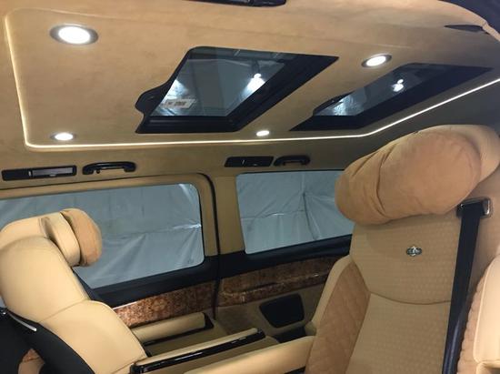 进口奔驰V250 商务车改装电动天窗可为乘客提供明亮、温馨的车内环境。天窗可电动开启,让人在旅途中更加亲近自然。遮阳帘可抵御强光的照射。在加配迈巴赫9宫格棚灯,让您欲罢不能。