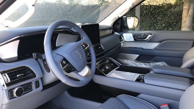 19款林肯领航员3.5TT 7座精雕细琢的内饰, 结合了美国胡桃木和高级真皮材料、丝光镍饰件与白色发光二极管等组合一起,营造出一个豪华、浪漫而又极具现代感的车内环境。方向盘和轿车一样的轻盈,周身散发出来的尊贵气息,让人肃然起敬。