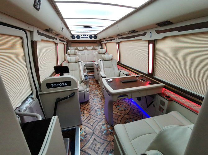 丰田考斯特在外观的的设计上与其他车系的设计并无太大的差距,米黄金色的车身设计,闪亮的颜色突出高贵的色彩,彩色的中线,突出丰田考斯特改装商务车的层次感并且不会因车身颜色的单一而显得过于单调。车门处大的电动台阶大的设置,我们的上下车提供方便。而贴心也成为丰田考斯特改装商务车的一大特色。
