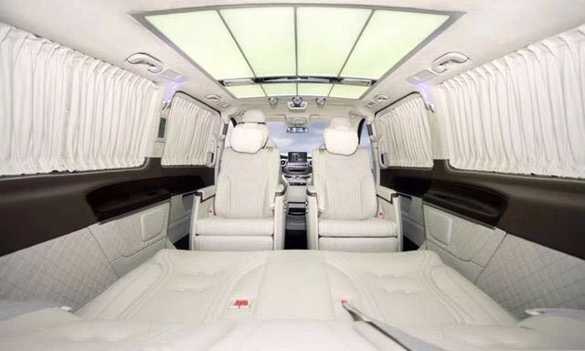 进口奔驰V250 商务车改装商务七座高级配置:前后舱双电池供电系统,GPS全球卫星导航系统带倒车影像,驾驶舱便携式电子冰箱,贵宾舱冷暖气分离出风口,进口奔驰V250 商务车改装改装商务车前后舱双空调独立控制系统,一键式超静音32寸高清液晶升降电视,日本健伍5.1影院级音响系统,220v电源接口USB.VGA多功能连接口,车载触控屏中控系统,车载智能空气净化器,全车豪华雀眼枫木装饰,全车柚木铝质地板,意大利进口Alcantaran麂皮绒顶,对于商务谈判与居家来说,这一切的配置都来得恰到好处。