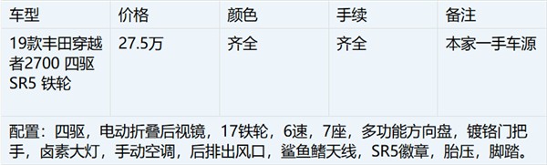 19款丰田穿越者2.7L内饰配备更是奢华。全车座椅真皮包裹。卫星导航系统。一体式中控台简介大方。内部超大使用空间也是吸引用户的一大亮点。为一款定位在SUV方向的车型,依然传统地采用了非承载式的车身结构,这样的结构非常有助于攀爬恶路。