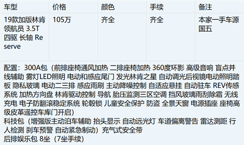 19款林肯领航员3.5TT新型发动机搭配全新的10速2F自动变速器,提供两轮或四轮驱动。马力456匹。车身长宽高/5636/2123/1933mm。 采用全铝设计使得整车的重量比上一代将减轻100公斤左右。值得肯定。3.5TT双涡轮增压动力通过新的六速自动变速器传递到四个车轮。疏齿比变速箱不仅 可以提供更快的加速性,而且可以降低油耗。新的动力系统通过增加变速器的速比范围,并融入更先进的发动机制造工艺,在提高汽车性能的同时,也进一步提高了燃油经济性。