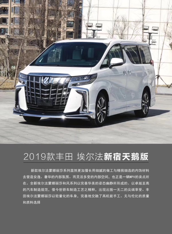 2019款丰田埃尔法 (配置|询价)蒙娜丽莎,新硕天鹅 丰田埃尔法逐浪版、和锦版、樱花版、墨麟版全系接受预定,丰田在奢华商务MPV商场将握有愈加杰出的优势。2019款全新埃尔法蒙娜丽莎以完善华美的姿态幽静所形成的、以卓越至高的汽车制造规范,借今世轿车制造工艺之精粹,出现出独一无二的尖端享受,轻量化车身,完善地交融了高机能手工、无与伦比的质量和质料选择,我们不做市场最低价,低了没保障,不做最高价,高了没感情;只挣我们该挣的钱,只交该交的情,认真做事,合作共赢,和我们合作不敢保证你花最少的钱,我敢保证让你省最大的心,得到质量,效率、利益、共赢局面,用心服务、传递信任!期待每一位新老客户的合作!详细价格和具体信息请咨询文章下方销售电话。