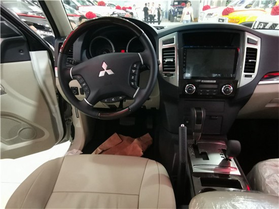 19款帕杰罗V97的内饰比较的简约平实,上深下浅的中控台采用了桃木材质以及银色装饰面板后,营造出了不错的豪华感和运动感。三幅方向盘采用的是真皮包裹,手感出众,两侧集成了很多功能按键,同时还配备了换代拨片,不仅提高了操作便利性,而且还增加了驾驶乐趣。