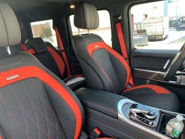 19款奔驰G63 (配置|询价)经过全新改款后依旧是无懈可击的外观造型,前大灯得到了升级圆形LED日行灯内还有方形大灯,外圆内方的造型力量感十足,仔细观察后视镜也变得圆润了。G63AMG无论是轰鸣的排气声浪,还是枪栓般的车门上锁声音都会令人心旌摇荡。初次接触2019款奔驰G (配置|询价)63 AMG的车迷需要一段时间来适应它的坐姿和乎垂 直的挡风玻璃,而一旦熟悉之后,你就会彻底沦陷于它宽大的座椅中。19款奔驰G63豪华精致的真皮包覆提供了足够的舒适性和支撑性,通风和加热功能让乘客 免受高温和寒冷的煎熬。中控台多处均采用碳纤维材料覆盖,带彩色TFT显示屏的AMG仪表盘、AMG主菜单和单独的挡位显示器以及采用白色照明的AMG门 槛。名贵的选材及 精湛的内装令人拍案叫绝。