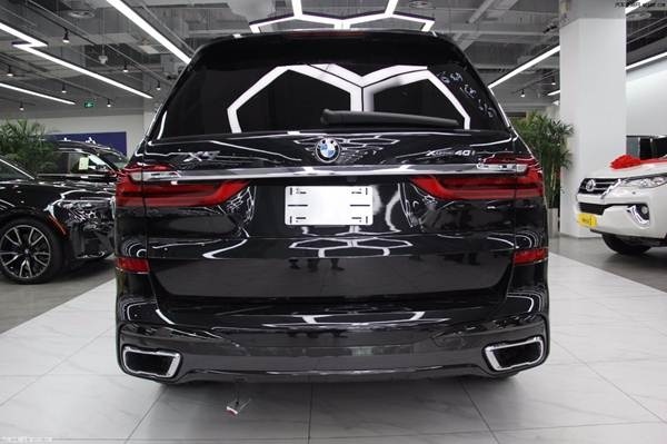 宝马X7车身侧面上方配有黑色行李架,前翼子板下方为长条状空气导流槽,腰线较为低矮且呈上扬之势,选用21英寸双五辐式拼色轮毂。车尾造型方正,LED尾灯组与粗壮的银色饰条贯穿相连,采用上下分段式电动尾门,排气采用双边共四出式布局,保险杠下方两侧配有大尺寸镀铬尾喉装饰。前保险杠中央为ACC自适应巡航传感器,两侧LED雾灯组与通风口融为一体,疏导气流的同时还可以为刹车系统进行散热。