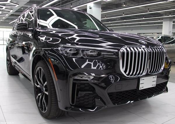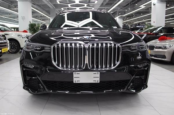近日店内获悉:宝马X7 (配置|询价)与定位一致的奔驰GLS (配置|询价)相仿,当然,定位使然,X7在宝马SUV族谱里尺寸也是最大的。而在设计上,X7的外观可以用“气势磅礴”一词来形容。由数字也能够看出,X7是目前宝马SUV中身材最大,同时也是定位最高的旗舰SUV。另外,尺寸更大的“双肾”进气格栅和更细的大灯也是宝马外观设计的一个趋势。