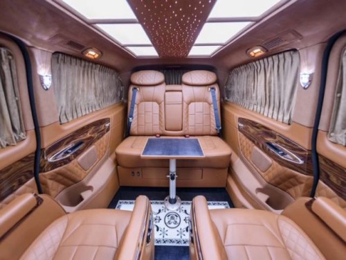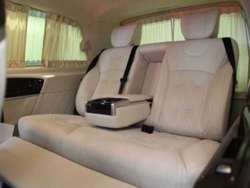 豪华一体式中央扶手箱,内里大有乾坤,隐藏有两个折叠式办公桌板。而扶手箱一直延伸到前不,设置有全车一些功能的按键,搭载着一个带蓝牙功能的先锋触控屏,展现了车身高端的科技氛围。底部设计有隐藏的保险柜,可供放置一些贵重物品或者机密文件。两个豪华航空座椅具有8项调节功能,仅有两座的设计,让座椅伸展开来无需左顾右盼,完全没有局限性。通风加热功能,让你感受冬暖夏凉的环境。