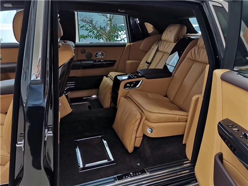 后排才是重中之重,电动折叠板和后排影院系统被巧妙的隐藏在前排座椅的椅背后,只需轻触按钮,便可以自如收放桌板和影院系统,带来完美的剧院体验。后排中央固定扶手做了重点优化,其中国可容纳带有威士忌酒具的酒柜、香槟酒具和冷藏箱,方便乘客畅快交谈,后排座椅角度可以任意调节,这一设计让客户无需转头便可视线自如交流。整个车厢内饰全部以最精美的高档材料装饰,使车内极具触感。