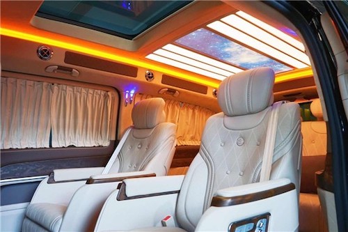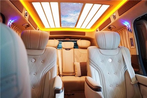 2020款奔驰V (配置|询价)250加长星河版,车如其名,一听名字就很美,而我最喜欢这台车的,也正是它的星空顶,像漫天银河一样璀璨,和劳斯莱斯一闪一闪的星空顶不同,它所呈现出来的是烟波浩渺的宇宙星系质感,配合旁边的LED柔光顶灯,给车内提供了非常梦幻的内部光源,非常好看。