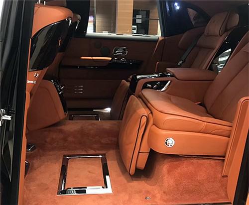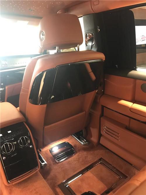 进入后排便进入了全车的核心,奢华程度不必多说。拜高大平整的车身所赐,没有一款可以拥有如此奢华的高度空间和威严的坐姿。座椅中间的扶手箱内空间比较大,并有植绒包裹,不易划伤贵重物品。两座椅中间的位置属于车载冰箱,量身定制的高脚杯可以固定在冰箱门板的位置,不会因晃动产生任何噪音。实质上,取悦后排两个座位上的乘客才是幻影的核心任务。