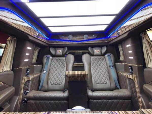 凯迪拉克总统一号隐藏六座商务车内饰部分:舱内隔断:可升降分隔屏,32寸超薄液晶电视 音响设备:BOSS环绕音响,DVD 舱内灯饰:氛围灯 LED灯饰。
