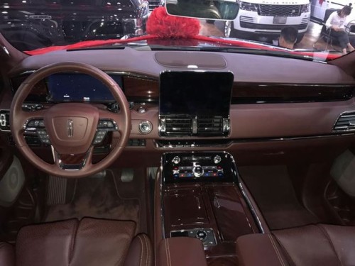 19款林肯领航员BLACK LABEL新款三幅式多功能方向盘带加热功能,真皮包裹方向盘兼具温润触感与典雅质感,三幅式设计令操控更加得心应手,在尊崇气息之上平添一分动感魅力。真皮部分可在短时间内加热,即便在寒冷的天气状况下,也能保持对温度的掌控感。内饰豪华气派,做工精细。车内大量皮质和实木材覆盖,让人即刻尊享定制体验。新款林肯领航员采用12英寸全液晶的仪表盘,悬浮式显示屏,科技感十足。