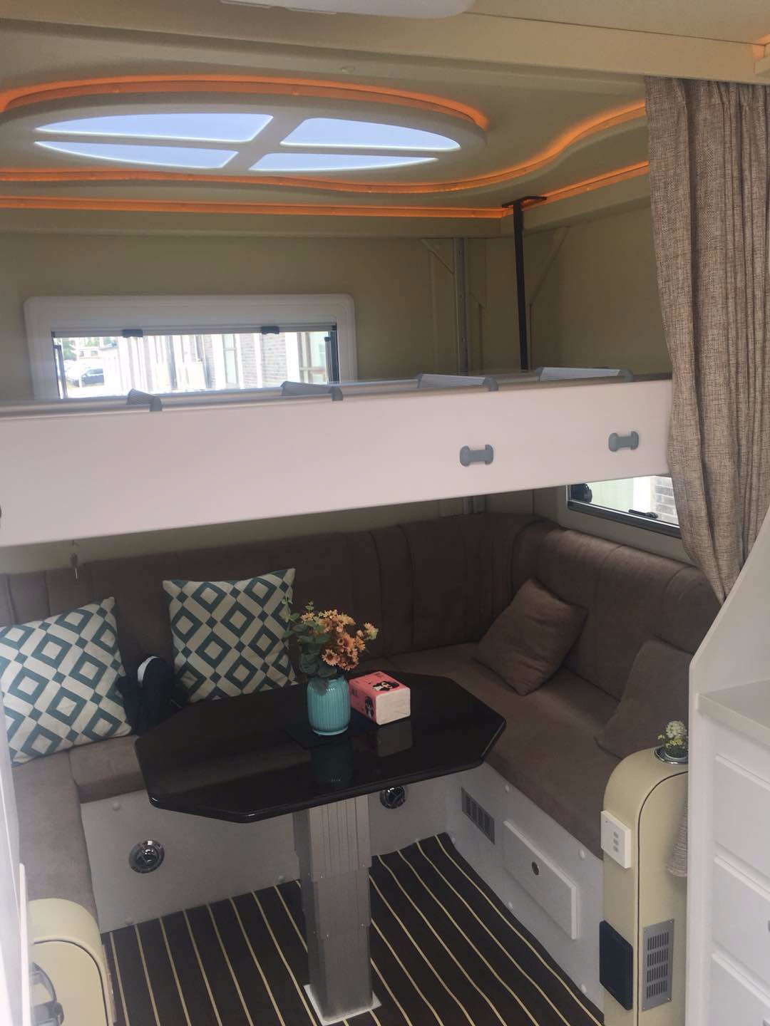 房车内部总结:设施齐全,与强悍的外观相比别有洞天,炊具的配备保证在野外生活也能吃上热腾腾的饭菜,家庭影院能为紧张刺激的越野旅程带来轻松,柔软舒适的沙发和可升降床更是提供居家的惬意,野外也可享受居家生活的温馨。