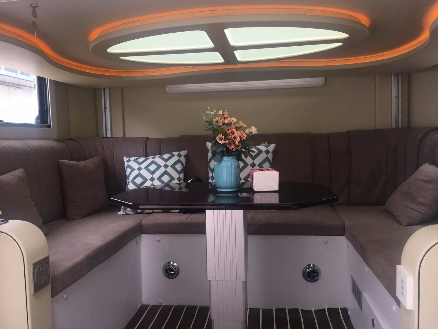从车门进入后就能看到会客区的卡座沙发座椅和升降餐桌,座椅一侧坐2人另一侧可以坐下3人,如果需要睡觉可以变成临时床铺。配备了32寸高清LED电视机、DVD机和BOSE音响等设备。配备顶级家庭影院系统,由32寸高清LED,高清DVD播放机,高档BOSE音响系统和动中通卫星电视接收系统所组成。微波炉和冰箱也必不可少。具备网络连接和WIFI功能的全球海事卫星通信系统,保证野外通信顺畅。