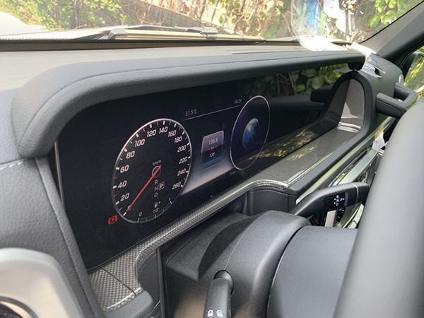 换代的最大最大亮点之一,给人耳目一新的感觉,双12.3英寸液晶通体屏幕外加与奔驰E (配置|询价) COUPE相同的空调出风口设计,让大G的内饰更加豪华,科技感也有所增强。沿用多年的四辐式方向盘也改为三辐式设计,三点以及九点处的多功能按键也与S级车型相同,两侧黑色触控按键可以控制仪表盘信息,其中行车电脑和右侧模拟仪表都可以进行切换,可显示油耗、续航里程、车辆状态等信息。在内饰用料方面,奔驰全新G级内部均采用了真皮材质包裹,手感极佳。在副驾驶台上还增加了碳纤维扶手,保护了车内人员在行车时的安全性。