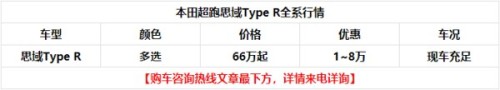 车型配置:320马力/2.0升直喷涡轮增压四缸发动机、6速手动变速箱、限滑差速器、4轮盘式制动器、Brembo前制动钳、后多连杆悬架、自适应减振系统、电子电动方向盘、驾驶座及前座安全气囊、驾驶座及前座侧面安全气囊、带侧翻传感器的侧帘式安全气囊、车辆稳定辅助系统、防抱死制动系统、电子制动力分配、刹车辅助系统、轮胎气压监测系统、LED日间运行灯、儿童座椅闩锁系统、高级音频系统/12个扬声器、音频显示/本田导航/语音识别和多视图、后置摄像头、蓝牙免提连接、USB接口、车载/安卓系统一体化、CD播放器、SiriusXM收音机、按钮启动、双区自动气候控制及空气过滤系统、麂皮运动座椅、驾驶座椅高度调整、皮革方向盘、铝制旋钮档、60/40分折叠式后座椅靠背、自动前窗户、电动驻车制动器、运动踏板、遮阳板化妆镜、12V电源插座、巡航控制系统、地垫、20寸合金轮殼、245/30、R20、高性能夏季车轮、自动启动/关闭头灯、LED雾灯、LED头灯/尾灯、后翼扰流板、运动三口排气口、航空设备、智能进入及安全系统、电动门镜、可变间歇挡风玻璃刮水器、后雨刷及洗涤器、无帽燃料填充本田路边救援 SiriusXM包括:免费激活