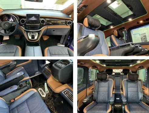 全新19款奔驰V250 商务车商务改装车高顶钻是在进口奔驰V250 商务车裸车基础上进行改装,包覆显示屏。主副驾驶以及侧门进行软包,进行隔音处理,以降低车内噪音,主副驾驶冰箱换成超大25升恒温加热或制冷恒温功能。