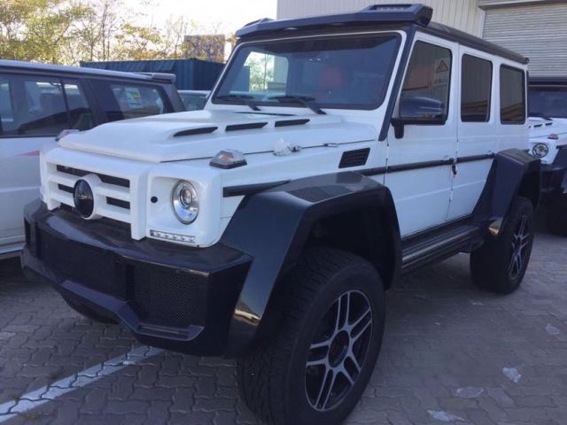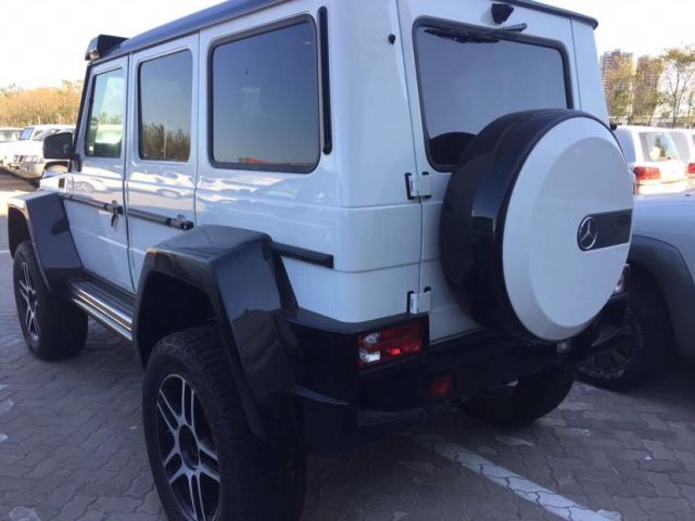 奔驰G350 4X4猛的一眼看去特别有气势,比普通的奔驰G系整整大了一个尺寸,全车基本造型与普通版G级一致,车顶上还有可拆卸的碳纤维扰流板,跟戴了小帽子似的。扰流板两侧均配备LED射灯,越野中非常实用。G350 4x4²的底盘也基本是6x6车型直接移植过来的,只不过少了一根轴而已,前后轴依旧保持了门式车桥的设计——这也是这款车最大的价值之一,要知道这种设计基本在军用车型中才会见到,比如乌尼莫克 和悍马H1,而奔驰现在已经将其放在了G级车型上,性能可以随意想象了。
