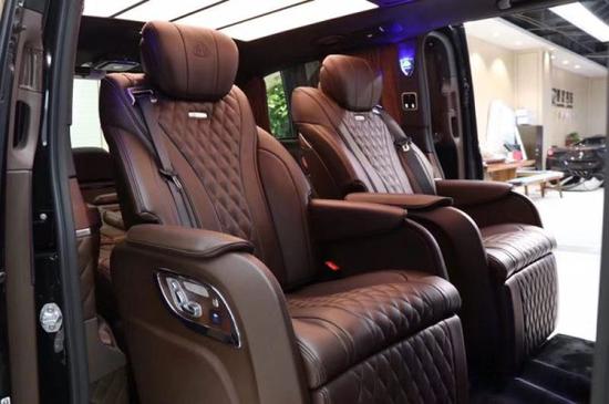 奔驰V260L高顶版的座椅采用飞机头等舱级别座椅,按照亚洲人的体型做出了相应的设计,座椅整体采用打孔Nappa真皮包裹,与舒适性填充物匹配,给予最高的乘坐舒适感,座椅支持多向电动调节、座椅按摩通风/加热、腰部支撑调节、腿托不管是躺着还是坐着;随时享受不同的乘坐体验