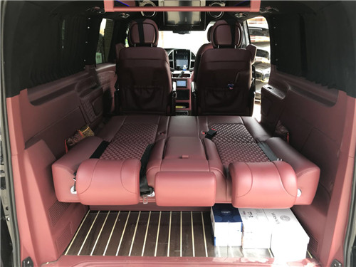 第三排座椅为标准的电动沙发座椅,可以通过隐藏在靠背中部扶手上的控制屏对座椅的靠背、腿拖进行控制调节,必要时可以完全放平,形成一张豪华双人大床。其绝佳的空间设计,让商务出行更加舒适放松,可调整的座椅设计能根据实际需求灵活改变,满足各种类型的使用需求。