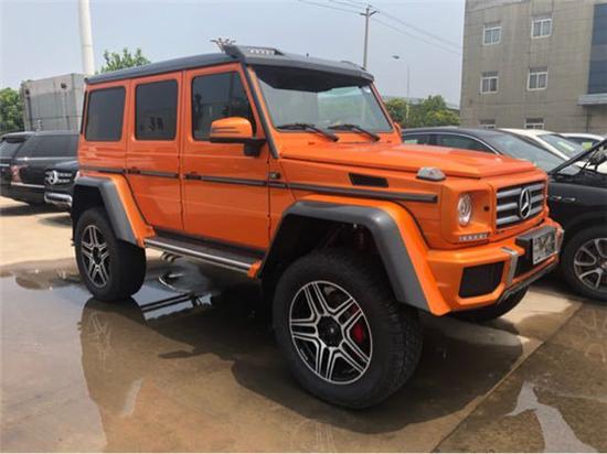 奔驰G500 4*4 配置:V8双涡轮增压4.0升发动机,顶配,AMG的M178,悬架升高离地450mm,新一代G级越野车的发动机和底盘还采用了牵引能力达3.5吨的设计,因此还能够牵引船只、货车或宿营车,车宽2100mm,车高2250mm,该车既可以将MT胎装在18寸两片式带锁轮圈上使用,还可以在城市道路上换上325 55/R22的铝圈。碳纤维内饰,前排座椅加热通风,碳纤维轮眉,车顶碳纤维扰流板,带LED上雾灯,门式车桥传动系统,黑色车顶,AMG包围,不锈钢双车底保护,可调悬挂,22轮。