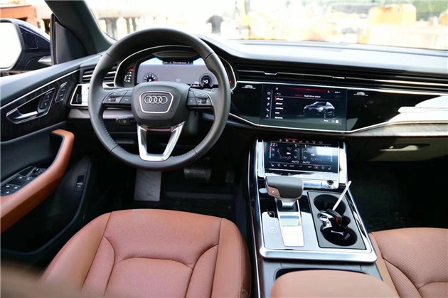内饰方面,奥迪Q8新车或将保留全新A8L的设计风格,内饰极具科技感,采用中控双屏和全液晶仪表的前卫设计,空调出风口贯穿整个中控台,下方双屏幕设计代替传统物理按键,在它的中控台上有些三块液晶显示器,与旁边的运动型方向盘互相辉映,充满了飞机驾驶仓的感觉。