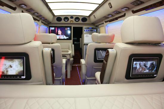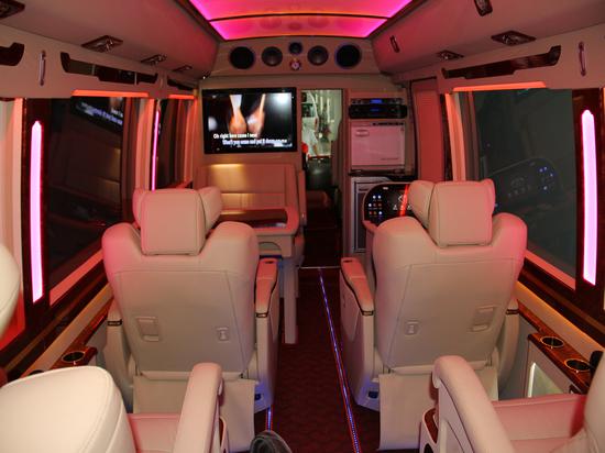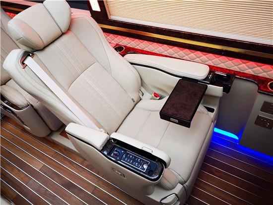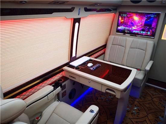 丰田考斯特豪华改装实拍效果 丰田考斯特改装商务车在内饰的设计上是极其贴心的,车载冰箱的设计贴心备至,高档的办公桌设计方便我们在商务办公中的需要。而车顶的LED大灯设计更是可以满足我们照明的需要。丰田考斯特车内航空顶灯以及车内驾驶席的半桃木装饰,这些设计在效果的展示上提升了丰田考斯特改装商务车的档次。