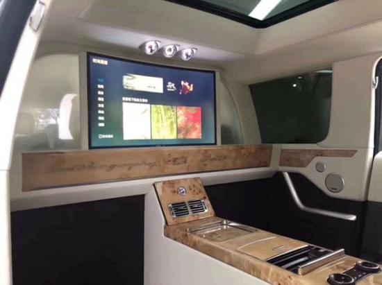 内饰方面:多功能方向盘、液晶仪表盘、触摸式显示屏均为车内标配,座椅也可以调整角度,前方路况一览无遗。由于皇家一号车身较长,所以配备了前后对讲功能。真皮座椅出自英国上等的品牌,座椅有细线捆边,手工一流。贵宾区双行政座椅多向电动调节,带按摩、加热、通风等功能,车顶以及车门装饰版全部为欧洲顶级小牛皮包裹,纯手工精心制作而成的高级地毯,后排配备有鞋托,特殊定制的LED氛围灯、及按钮控制系统,让您置身车内尽可享受舒适奢华的贵宾式待遇!