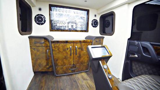 而内饰方面,可以说是达到了装甲车型中内饰的极致,奢华二字不足以形容这样的内饰。双座位设计,宽大的座舱空间,座椅大量使用Alcantara麂皮与真皮打造,乘坐质感不言而喻。配有4K电视、Apple TV、Apple HomeKit等高科技配置,整体的豪华感蹭蹭往上涨。车顶模拟日光的照明设计,可人工调节。