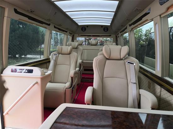 丰田考斯特内部采用独立航空座椅设计,加宽加大乘坐非常舒适,并且在中央配备活动圆桌,即可办公也可在长途过程中进行娱乐!侧壁采用软包设置,提高了车 内的美观性!不再为面对着冷冰冰的内饰而烦恼!车内轮毂座椅位置,我们采用了独有的升级台阶设计,这可谓设计上的一大亮点,好处有第一,解决了轮毂位置乘 客的不舒服,并且提升了座椅的高度,让你的视野更加开阔!