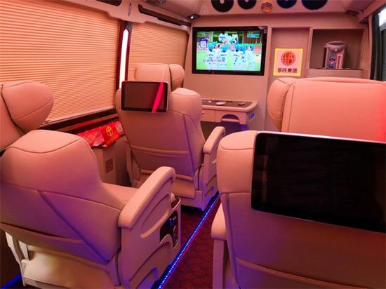 半隔断加32存的车载液晶显示器让你在车辆行驶的过程当中,可以随时关注电视节目,有一种家的感觉,而且有28个频道可以供你选择,在首长席位置我们加载了 一个办公桌,让你在移动过程中办公不再是梦想!秘书席位置,我们不但配备了米书桌,而且在上面还设置了操控台,灯光电源娱乐设施轻轻拿手一触即可!