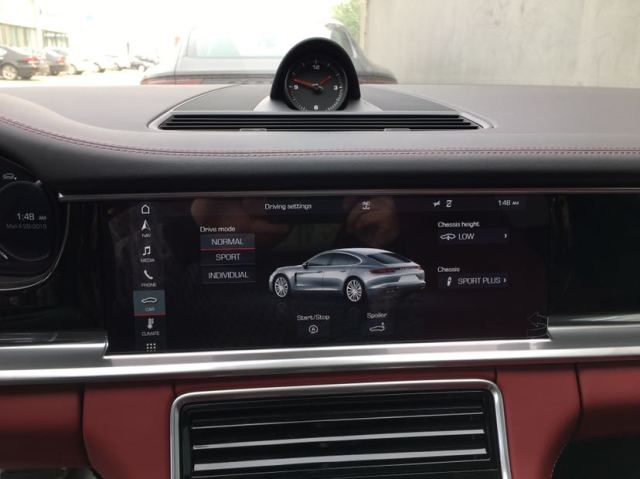 内饰方面:全新一代Panamera的内饰化繁为简,一块硕大的12.3英寸触控屏取代了绝大多数的物理按键,原本位于地台附近的按键也改为触摸控制。钥匙孔依然位于中控台的左侧,传承了保时捷赛车的基因。三幅方向盘的握感非常舒适,银色的换挡按键更像是镶嵌在方向盘上的一件艺术品。