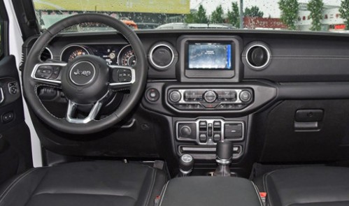 全新一代牧马人内饰采用对称式设计,细节处加入了镀铬装饰条以及白色缝线。中控台上配有四个圆形空调出风口,中间8.4英寸的中控液晶显示屏幕装载了Jeep第四代Uconnect多媒体系统。新车新增了一套名为Selec-Trac四驱双速分动箱系统,可以利用4H AUTO挡,通过前轴智能分离技术实现两驱和四驱的切换。