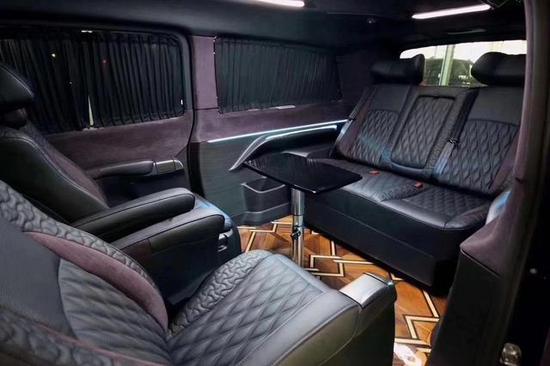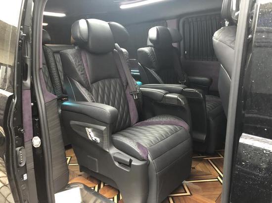 2019奔驰威霆改装商务车宾法版——采用全新的设计创新,整车座椅采用双色拼接点缀设计,以黑色皮革为主色,配以紫色的麂皮,让人眼前一亮,起到画龙点睛的效果。侧壁及顶棚大面积运用紫色黑色双拼,传承宾法系列低调稳重的双拼经典色彩。