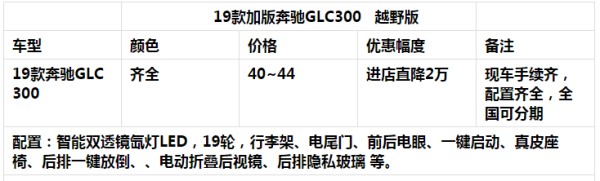 19款奔驰GLC (配置|询价)300各种版本大量现车到店,限时秒杀降价优惠不断,配置手续均齐全,本公司资产优质,实力雄厚,信誉良好代办保险,(包括外省市照)可全国办理分期,随时恭贺每一位爱车人士的到来, 车行天下,服务万家。详情请见下方联系方式。凭此文章截图到店领礼包。19款奔驰GLC300 配置:19轮 行李架 泊车辅助 前后电眼 腰部支撑 电动腿拖 倒影 电动折叠后视镜 真皮座椅带记忆 桃木内饰 二排隐私玻璃 定速巡航 换挡拨片 电动调节方向盘 LED 电尾门 后排一建放倒 一键启动 单选配置:全景天窗