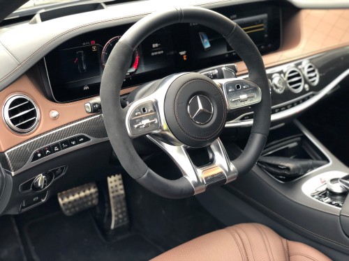 2019款奔驰S63AMG报价,S级 (配置|询价)豪轿低折让利。19款奔驰S63AMG大面积的下进气口,充满了攻击性,进气格栅上的星徽标,使外形更加激进,车身线条非常动感,车顶曲线由车头平缓过渡到车尾,独树一帜的外观外形设计,让其有着强烈的跑车风格。进气格栅部位一条粗壮的镀铬金属装饰条贯穿左右,黑色边缘镀铬中央装饰条上嵌入了AMG的字样,大气中彰显着尊贵。
