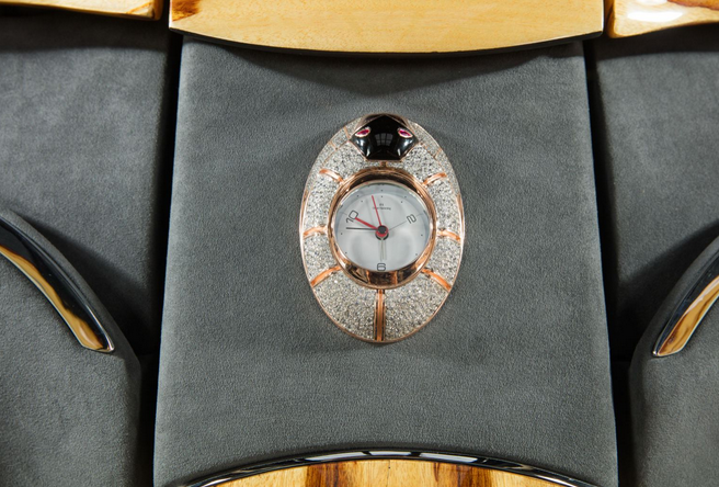 美杜莎系列车型大量植入了珠宝元素,珠宝的设计是由意大利宝格丽珠宝设计师亲自指导,采用蛇的元素创作设计全新的整车内饰,一系列珠宝内饰均采用925银为底材,精细的镀以18K玫瑰金和18K白金双色材质。前吧台座椅中心镶嵌了英国进口钟表,表盘周围镶嵌588颗锆(gao)石,散发出来的光芒引人注目,极具奢华感。