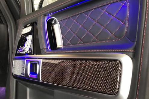 19款奔驰G63 AMG精选皮革搭配多疤。大多数奔驰的电子系统都出现在这个全新的豪华内厢里,包括COMAND和HD卫星导航系统。中控台多处均采用碳纤维材料覆盖,带彩色TFT显示屏的AMG。
