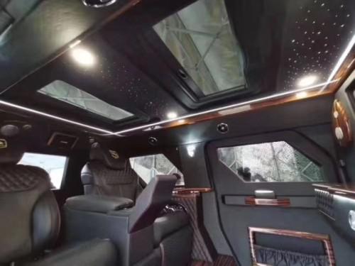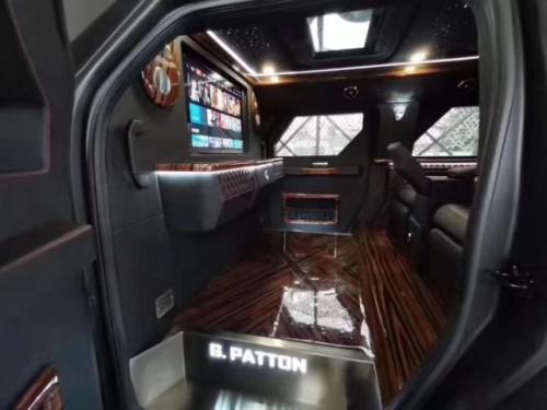 “乔治巴顿”越野车的内饰可以用“奢华”、“精致”、“体贴”来形容。后舱采用了豪华商务车布局,内饰色调以米白色。酒红色两种搭配,北美皇家桃木做以装饰;前、后舱之间设有隔屏,配以22寸超薄显示器,在最大程度上保证了后舱乘客的私密性的同时又可以在旅途中享受影音快乐;舒适独立的多功能电动真皮座椅,让您置身其中会忘记自己身处外观如战车般的乘坐舱内。