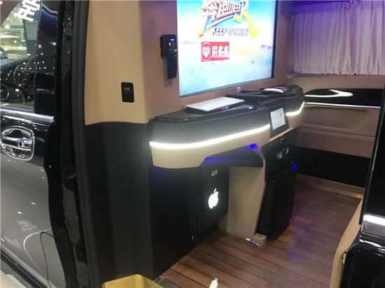 2018款奔驰V260L改装苹果版七座采用2+2+3排列方式长宽高为5370mm,1928mm,2080mm,配置:整车采用原厂一次性冲压钢顶,全车柚木地板,曲面屏42寸高清液晶升降电视带有卫星接收功能,独立苹果电脑主机,鼠标一键式操作,电子中控触摸屏,菲利普娱乐系统,进口柚木地板,移可拆卸移动办公桌板,BOSE5.1立体环绕音响系统,独立25升冰箱,进口航空座椅等,座椅加热,通风,按摩,记忆,180度度旋转,前后左右电动调节,手动侧滑门,全景天窗,220逆变电源,外接电源,后排可放倒沙发床,牛角吧台去两侧包裹,明星版双运动腿托,空气净化器,迈巴赫星光顶,私密隐私窗帘,奔驰专用导航系统及倒车影像,前后人机对讲系统,踏板迎宾灯,车载电热水壶,咖啡机,梅赛德斯镀络套件等。