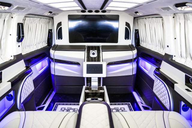 19款进口奔驰V250房车贵宾舱则用采用豪华皮革、麂皮绒包覆,前后舱采用电视+吧台的实用隔断,BOSE5.1殿堂级音响环绕系统+32寸高清升降电视+索尼蓝光DVD的经典车娱组合,给您舒适与娱乐相结合的享受。