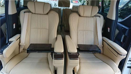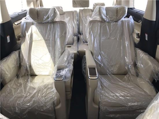19款丰田埃尔法商务车选用航空头等舱等级的多功用座椅,限量版每个座椅都精心调配了至尊黑色打孔皮革,它不 再是单纯意义上的座椅,而是躺椅于一体的休息空间。进口埃尔法车内的设计很有格调,更多表露出来的是气派和动感。中控台布局十分清晰,第三排座椅加14公分 第二排阅读灯 可收纳写字台 座椅加热通风